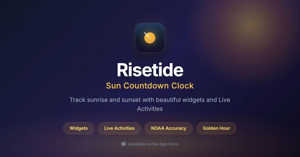 Risetide is a beautiful sun countdown clock for iOS that tracks the precise time remaining until sunrise or sunset. Features stunning widgets, Live Activities, golden hour tracking for photographers, day length trends, and gorgeous time-of-day gradients. Free with optional Pro upgrade for advanced features.
