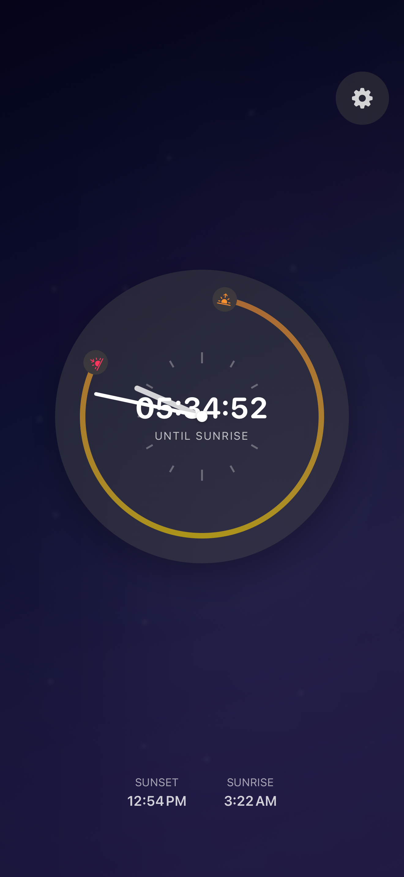 - Real-time countdown to sunrise and sunset with beautiful analog clock display